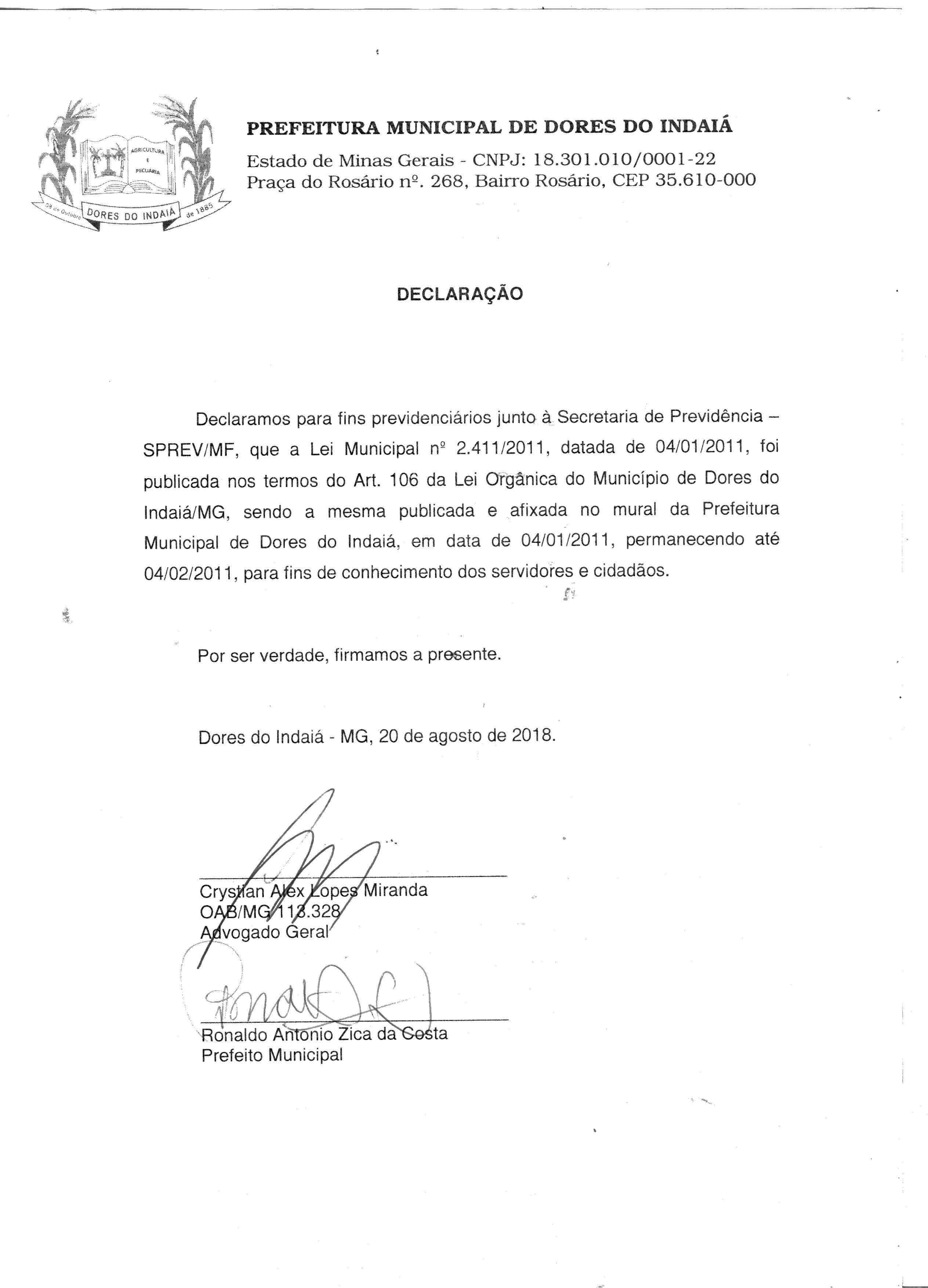 LEI Nº 2411/2011 - Dispõe sobre a criação da Unidade Gestora Unica Municipal de Dores do Indaiá e dá outras providências;